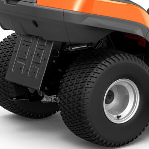 Die großen und breiten Hinterräder verbessern die Bodenhaftung und verringern das Risiko empfindliche Flächen zu beschädigen.