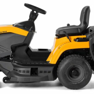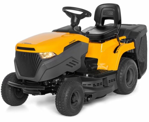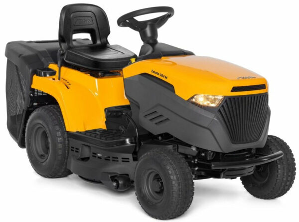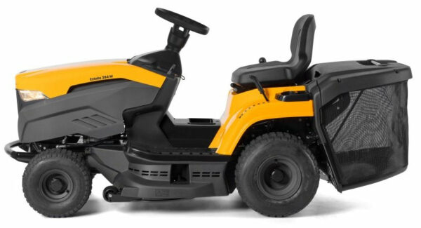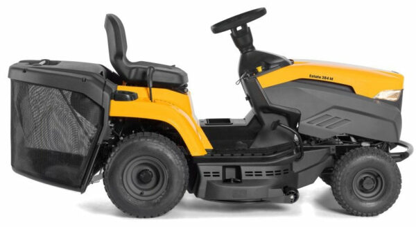 Der Rasentraktor STIGA Estate 384 M ist ausgestattet mit einem ST 350 Powered by STIGA Benzinmotor mit einer Nennleistung von 5,8 kW bei 2400 U/min. Dieser Gartentraktor verfügt über ein Schaltgetriebe mit 5 Vorwärtsgängen und 1 Rückwärtsgang, einen 200 Liter Heckfangkorb und ein erhöhtes ergonomisches Lenkrad für komfortables Fahren. Bei dem 84 cm breiten Mähdeck mit zwei Messern lassen sich 7 verschiedene Schnitthöhen zwischen 25 und 80 mm auswählen. Die praktische elektromagnetische Messerkupplung wird per Tastendruck gesteuert. Der Estate 384 M kann mit dem separat erhältlichen STIGA Multiclip-Dübel auch zum Mulchen von Grasschnitt verwendet werden. Mulchkit und Batterieladegerät separat erhältlich